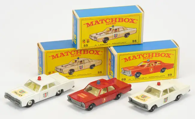 Matchbox Regular Wheels Emergency Service Cars Group. (1) 55c Ford Galaxie Police Car - white body with hood & door decals, red roof light, bare metal number 55/59 base (2) 55d Mercury Park Lane Police Car - white body with hood & door labels, red roof light, bare metal base with Mercury on raised platform, chrome hubs with black plastic tyres (3) 59c Ford Galaxie Fire Chief Car - red body with hood label & door decals, blue roof light, clear windows, ivory interior, bare metal dual numbered 55/59 on flat base - Good Plus to Excellent in Good Plus to Excellent Plus type E42 boxes. Est : £50 - £70.