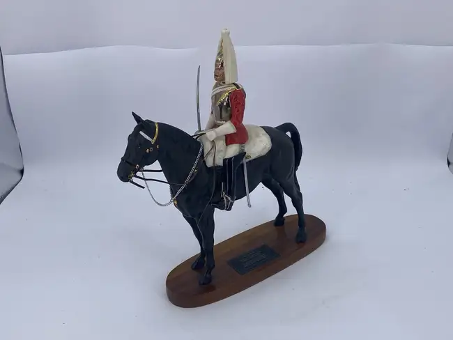 Beswick, a “Life Guard – A Trooper in Mounted Review Order” connoisseur model, modelled as a mounted Life Guard in ceremonial uniform with plumed helmet and drawn sword, on a black horse with chain and leather bridle detail, raised on an oval wooden plinth with titled plaque reading “Life Guard – A Trooper in Mounted Review Order – A Connoisseur Model by Beswick England”. Not checked for restoration. Conditions generally appear Excellent to Excellent Plus, some light wear to reins noted. Est : £60 - £80.