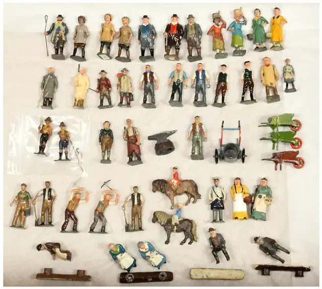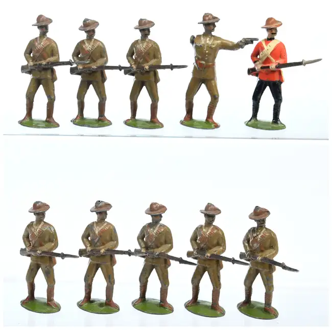 Britains - From Set No. 104 'City Imperial Volunteers', Unboxed. Comprising: 8 x infantrymen (1 missing) plus officer. All are 1900 version (all with paper labels dated 1 June 1901, the first dated set Britains produced). Also includes single City Imperial Volunteer figure in red coat with oval base (from same period). This figure was sold separately and had no set number. Conditions generally appear Good to Good Plus overall. Est : £80 - £120.