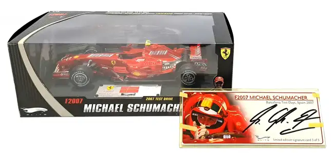 Hot Wheels Elite (Mattel), Signed, a boxed N5423 F2007 Michael Schumacher "2007 Test Drive" F2007 Barcelona Test Session 13/11/2007 with fabric swatch from and authentic Scuderia Ferrari racing suit and signature card 3 of 5 without COA believed to be from a Hot Wheels Elite Promotional Campaign. Although not checked for completeness conditions generally appear Near Mint to Mint in a generally Excellent Plus to Near Mint box. Est : £80 - £100.